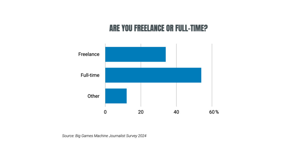 Freelancers are the backbone of most news media publications, and the video game industry is no different. 54% of respondents told us they hold full-time roles in games media, while 34% are freelance.