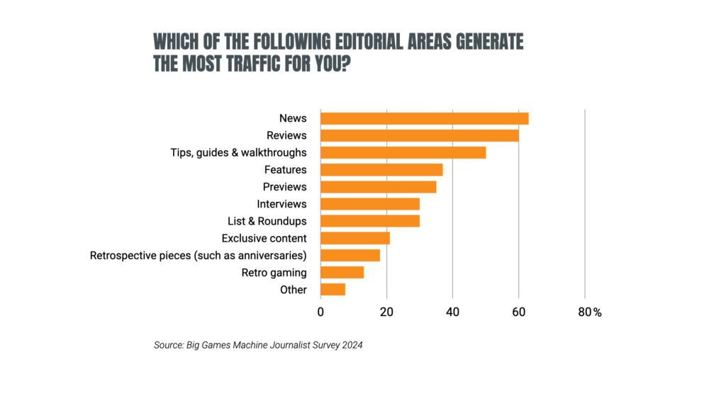 As you may expect, news (63%), reviews (60%), guides and walkthroughs (50%) are the most effective editorial areas for gaming journalists when it comes to driving web traffic.