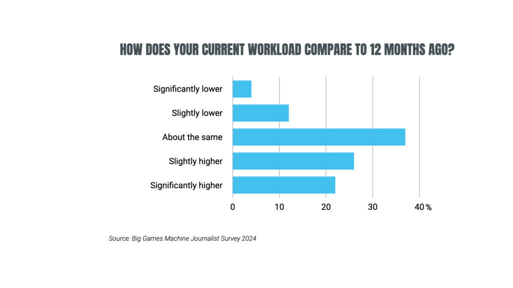 - Game journalists are overworked. Nearly half of respondents (47%) say their workload has ‘slightly’ or ‘significantly’ increased compared to 12 months ago. Only 15% of respondents say their workload has lightened.
