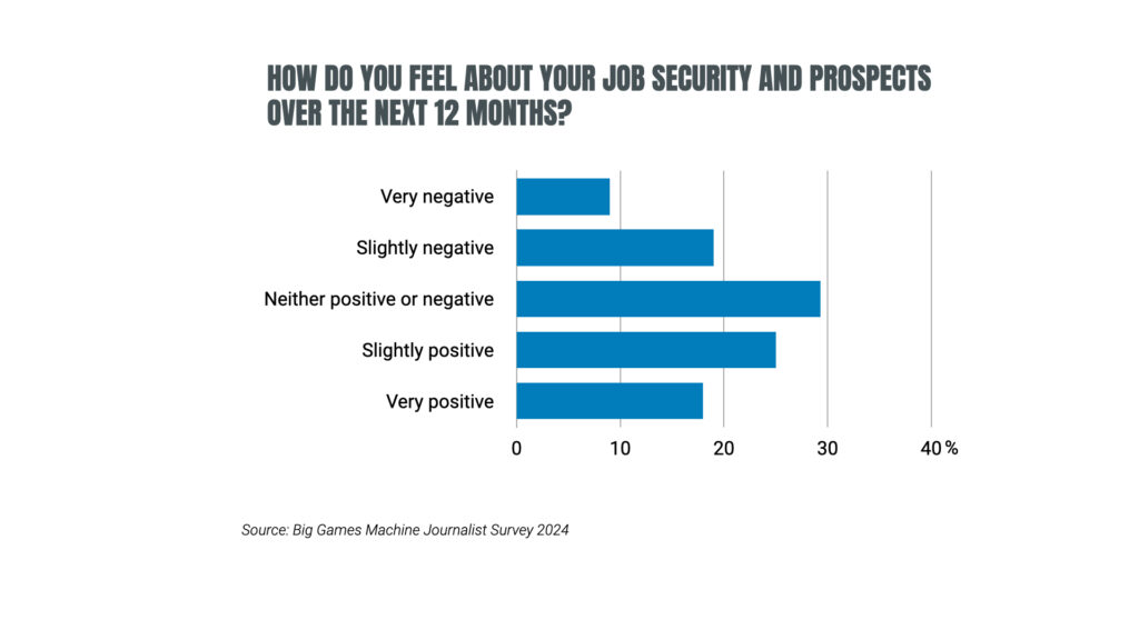 - Despite the challenges and pressures of games journalism, 43% of respondents feel somewhat or very positive about their future job prospects and security over the coming 12 months. That’s compared to 28% feeling somewhat or very negative.