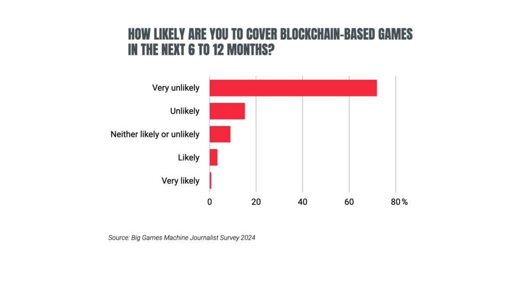 According to our survey, not very! 87% of game journalists are unlikely or very unlikely to cover blockchain games in the next six to 12 months, while only 4% are likely to cover them.