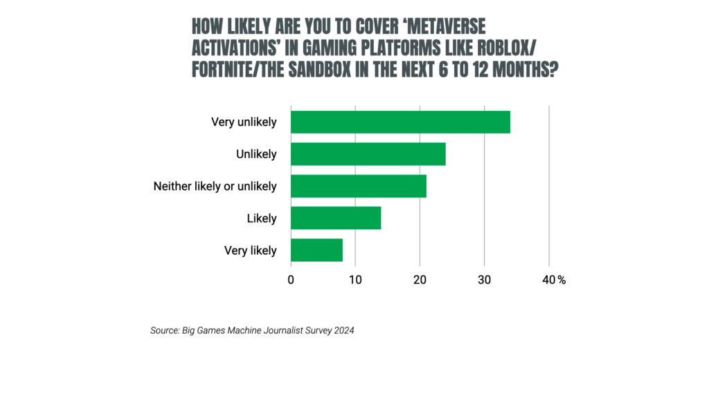 We asked respondents how likely they were to cover such metaverse activations. For the most part, games media doesn’t believe these stories are relevant to their readership, with more than half (58%) of respondents ‘unlikely’ or ‘very unlikely’ to cover metaverse activations.