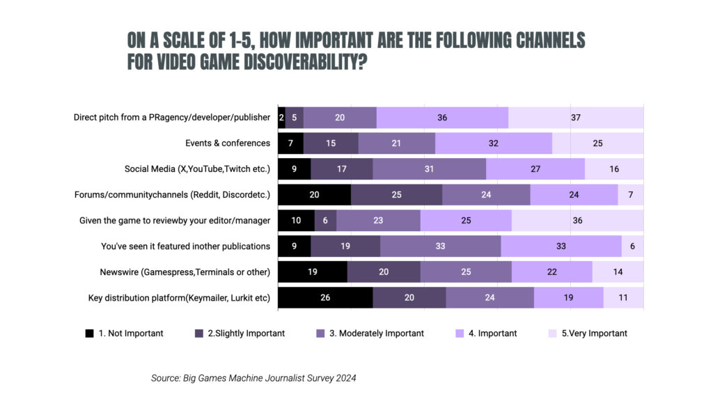 We asked game journalists to rate eight different discoverability methods on their importance (1=not important to 5=very important), ranging from events and conferences to direct pitches from PR agencies or studios/publishers.