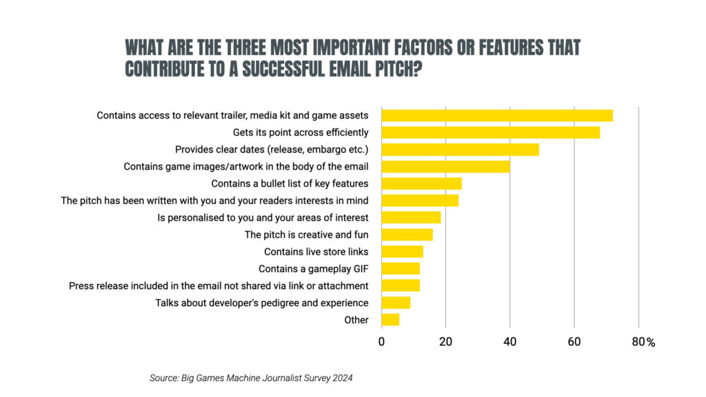 The most important factor determining the success of a PR pitch was emails, including ‘access to a relevant trailer, media kit and game assets’, as 72% of respondents voted for.