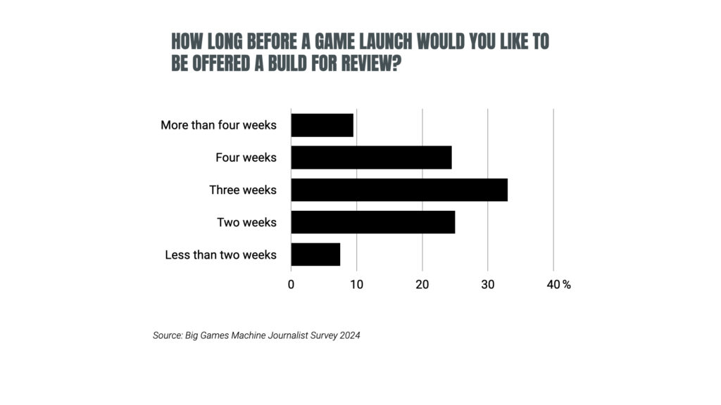 Over two-thirds of respondents (67%) want to receive review copies three weeks or more before a game’s release.