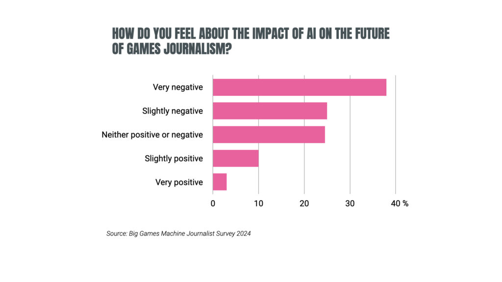 - 63% of respondents think AI is having a ‘negative impact’ on video game journalism. Only 12% think it has a ‘positive impact’.