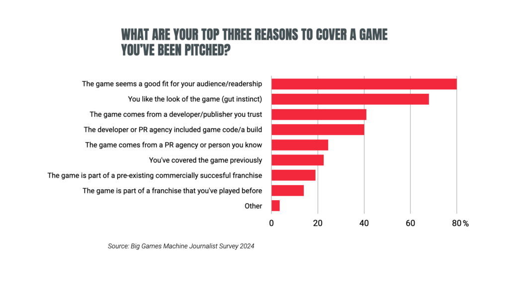 As for the most important factors influencing why a journalist would decide to cover a game, it comes down to that being the right fit for their audience (80%), a general preference (68%) or the game coming from a developer or publisher they trust (41%).